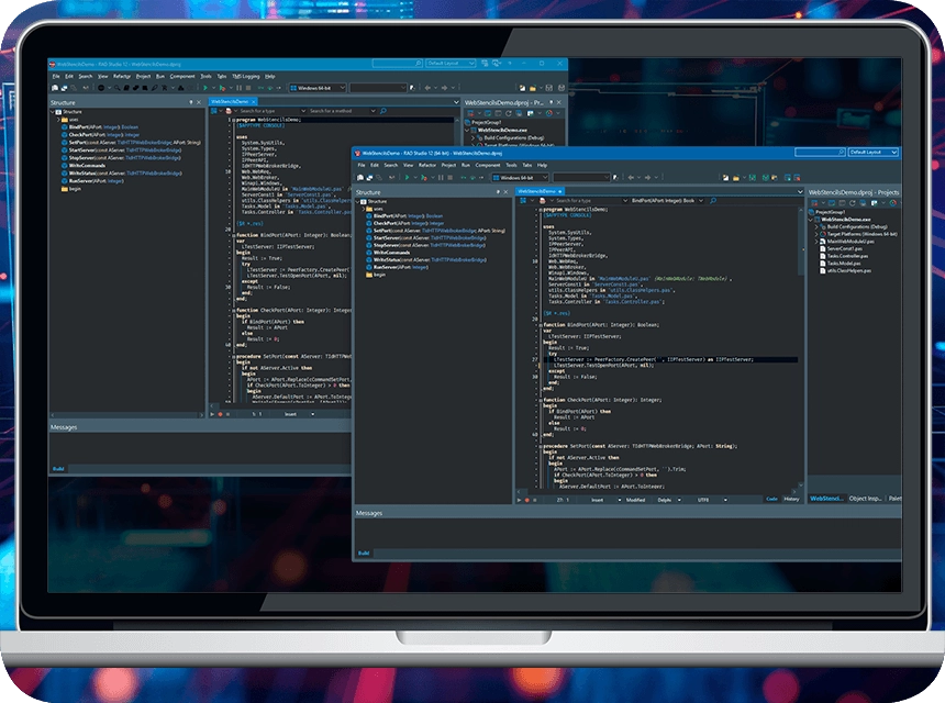 WebStencils – integracja oparta na wykorzystaniu skryptów uruchamianych na serwerze. Przetwarzanie plików HTML przez WebBroker i RAD Server, w celu dostarczenia nowoczesnych stron internetowych zasilanych danymi z serwerowych aplikacji RAD Studio. Rozwiązanie służy również jako podstawa do wykorzystania HTMX. Nowa wersja rozszerza dostęp do zagnieżdżonych obiektów i podtabel w zagnieżdżonych datasetach oraz wprowadza ulepszenia w obsłudze znaków kodowanych w UTF8. (RAD Studio)