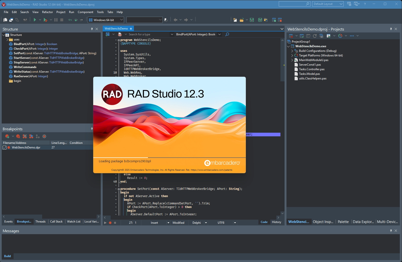 64-bitowe IDE w wersji Initial Releas, tworzenie kodu wspomagane przez AI, kompilator i narzędzia C++ oparte na Clang, nowa biblioteka szablonów Webstencils, 64-bitowe wersja DelphiLSP, Delphi RTL, VCL, i FireMonkey