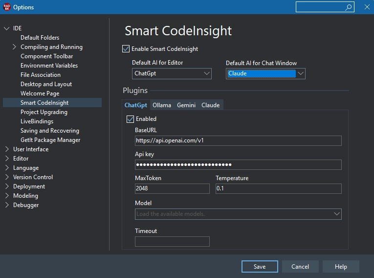 Nowa otwarta architektura wspiera wykorzystanie wtyczek AI, obejmując OpenAI, Gemini, Claude i Ollama. Dzięki Smart CodeInsight użytkownicy decydują, czy i jak korzystać z AI, a także mogą tworzyć dodatkowe wtyczki, o ile oferują publiczne REST API (RAD Studio). Wersja 12.3 wprowadza nowe rozszerzenia do interfejsu użytkownika, aby usprawnić korzystanie z opcji czatu. Okno czatu obsługuje język Markdown, a okno dialogowe konfiguracji Smart CodeInsight oferuje listę dostępnych modeli pobranych z silnika AI. (RAD Studio)